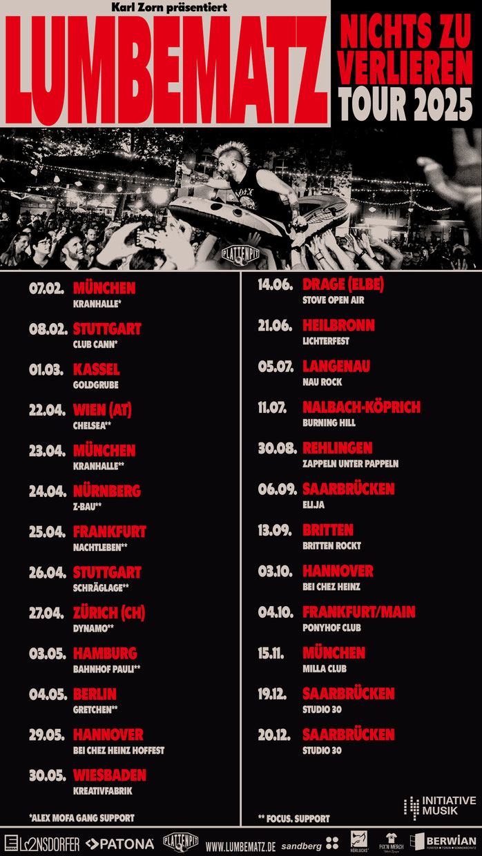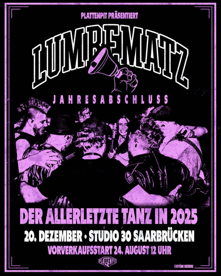 2025 erscheint ihr neues Album LIGA. Es knüpft an diesen Geist an, klingt aber rauer, ehrlicher und intensiver als je zuvor. Die Songs, die live im Studio eingespielt wurden, erzählen von Freundschaft, Verlust, Neuanfängen und den kleinen wie großen Geschichten des Lebens. Lumbematz sind erwachsener geworden, aber eines bleibt: Ihre Konzerte fühlen sich immer noch an wie eine wilde Klassenfahrt – authentisch, nahbar und unvergesslich.